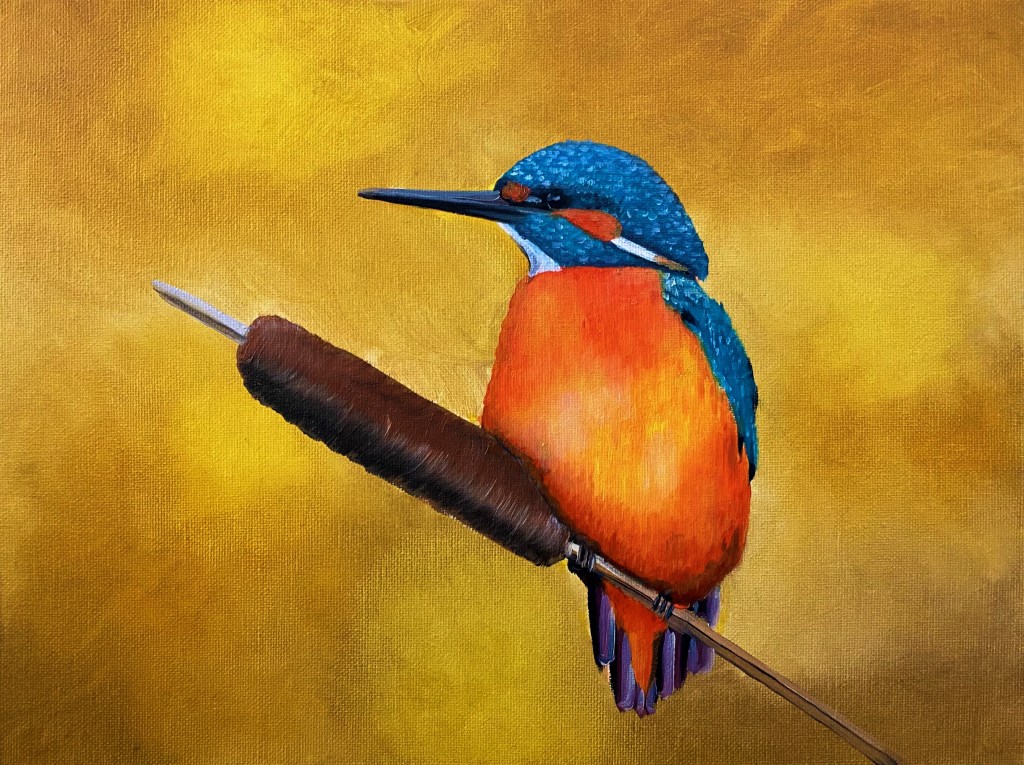 Kingfisher on Bulrush (2021) 40.6×30.5cm oil on canvas