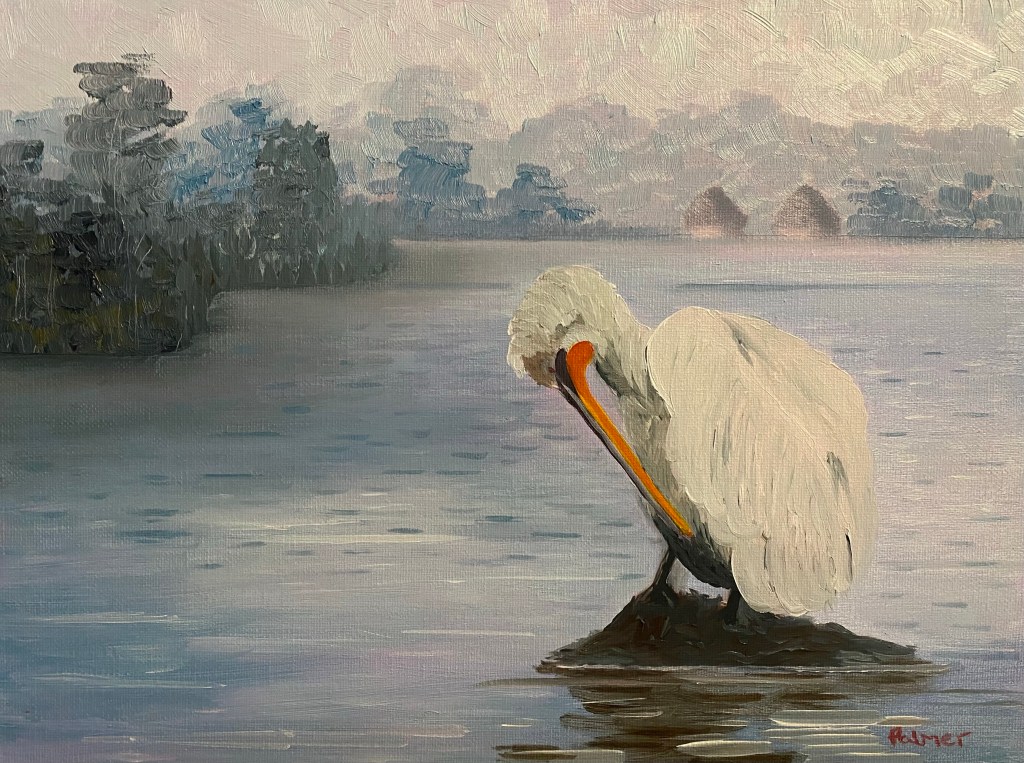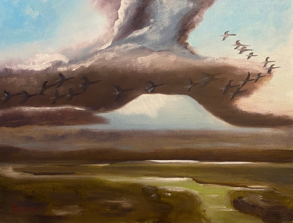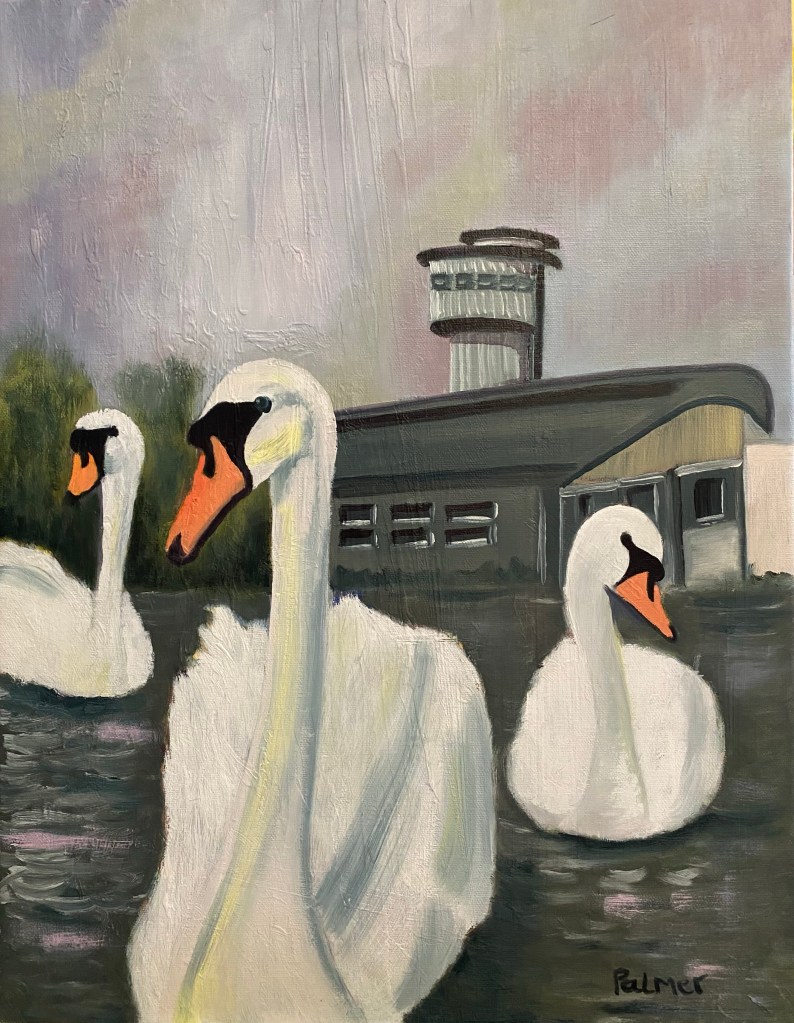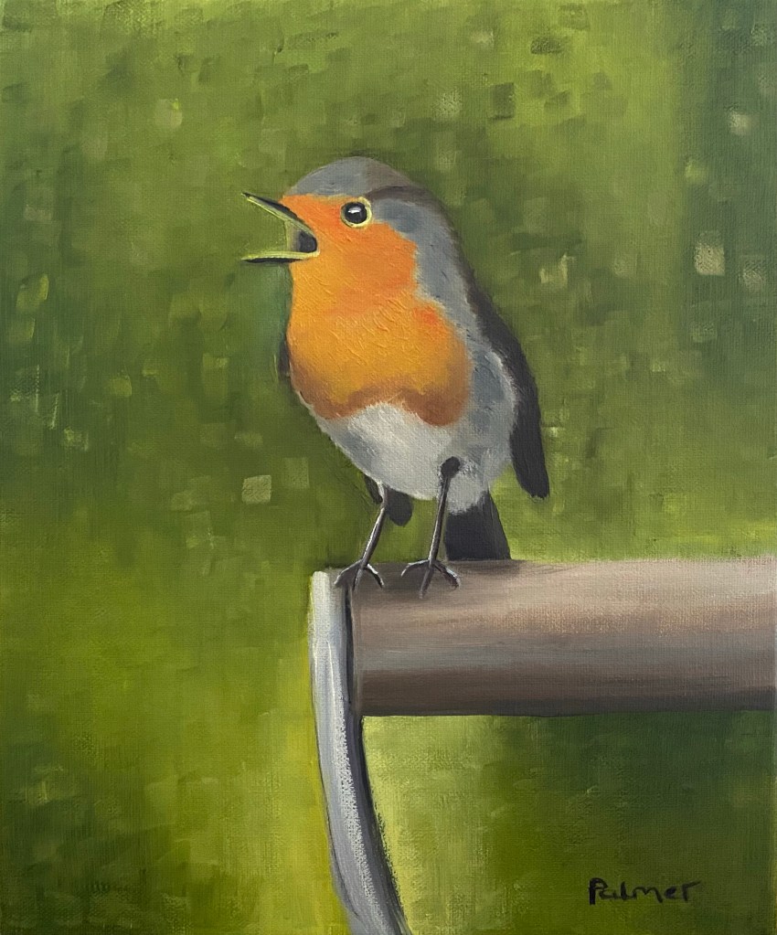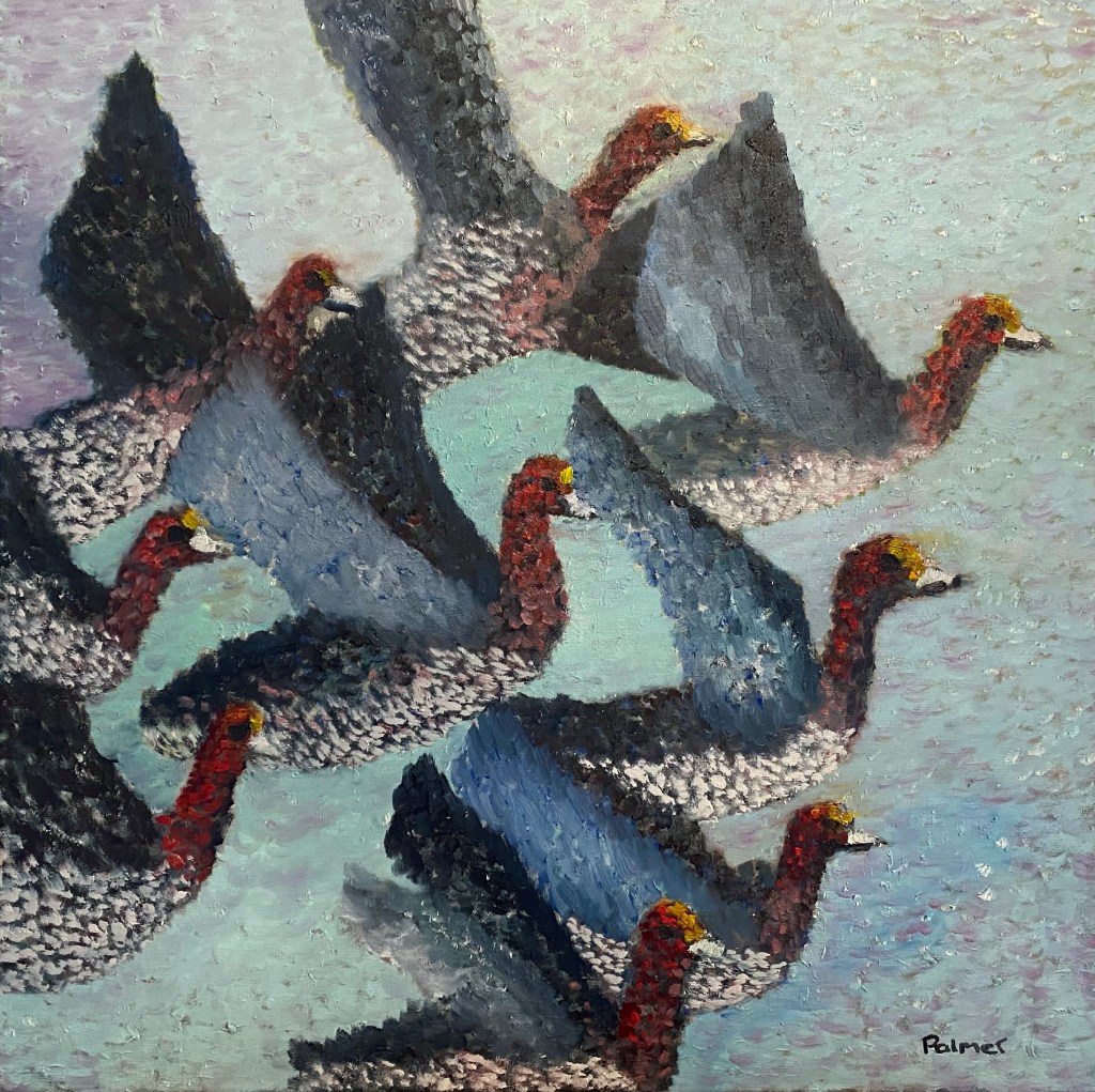 Greylags over Arundel (after Scott) (2021) 40.6×39.5cm oil on canvasMarsh Harrier (2021) 30x30cm oil on canvasDalmatian Pelican (2021) 40.6×30.5cm oil on canvasWasp in my coffee, (2019), 60x60cm oil on canvas Robin (2022) 30x25cm oil on linen. Slimbridge (2022) 35.5x46cm oil on canvas Ducks (2022) 61x61cm oil on canvas